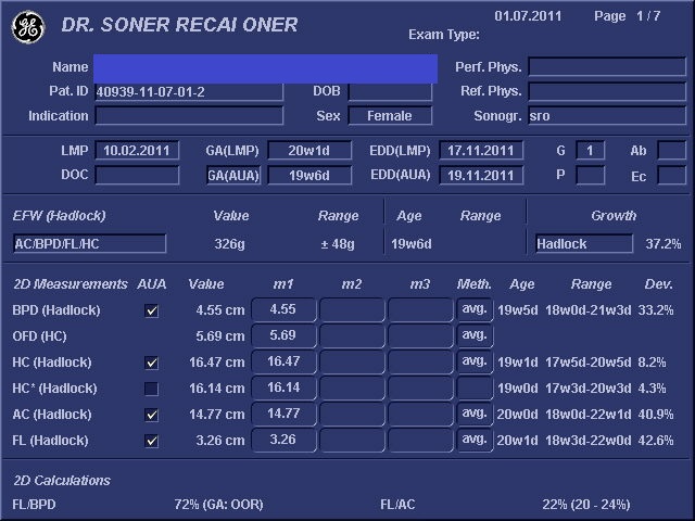 Ultrason cihazı ile bebeğin uluslararası yönergelerde belirlenen bazı standart görüntüleri elde edilmekte ve bu görüntü kesitlerinde normal dışı bulguların olup olmadığı kontrol edilmektedir.